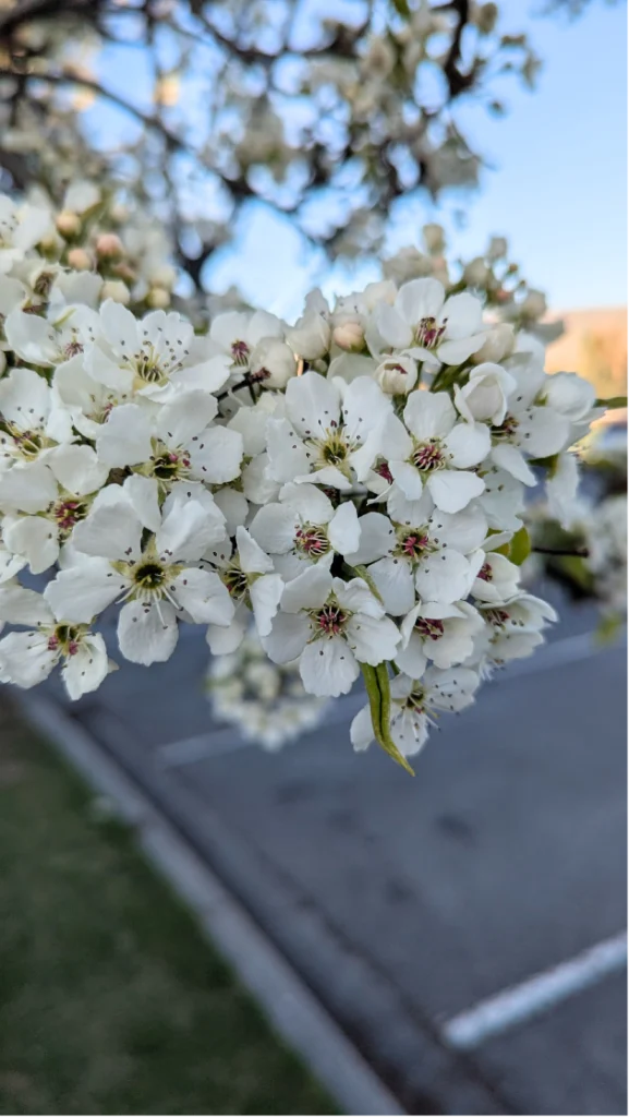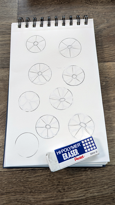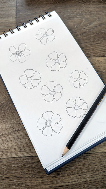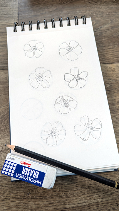 For this prompt, I spent a little time looking at the white blossoms growing at a nearby school. I googled them and discovered they are ornamental pear trees. After snapping a few photos I started by sketching them as simply as I could. Instead of worrying about making them perfect, I focused on noticing their overall shape first. I broke each flower down into basic forms, beginning with a center circle and lightly mapping out the petals, I also like to use a guide sheet under the one I’m drawing on. Below is an image of the quick guides I drew to use for this prompt.
